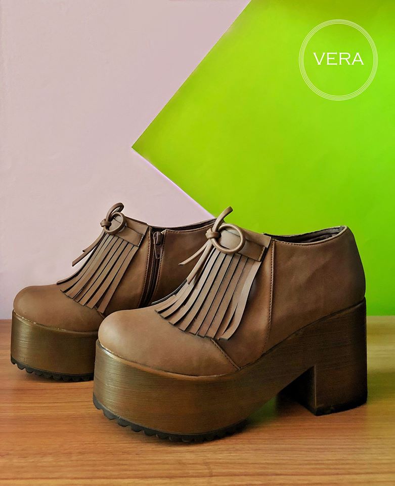 V A L E N C I A, Un estilo moderno y arriesgado. Con plataforma alta en brown y diseño de flecos en light brown.